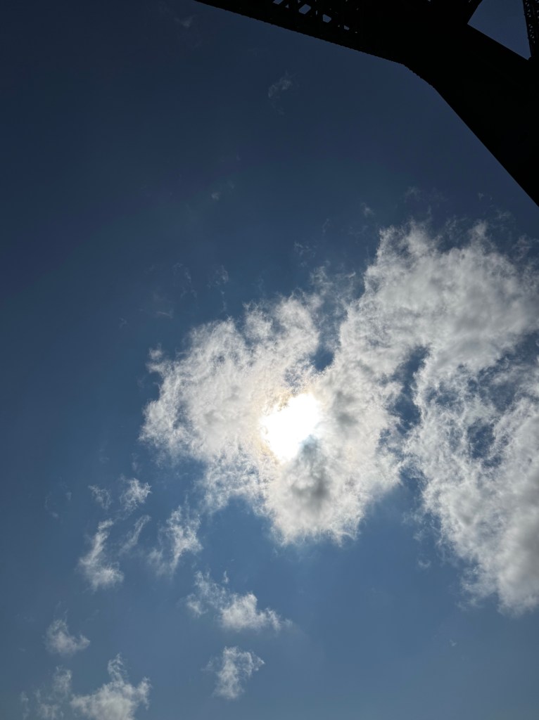 i am standing inside a large structure, the blue sky above me