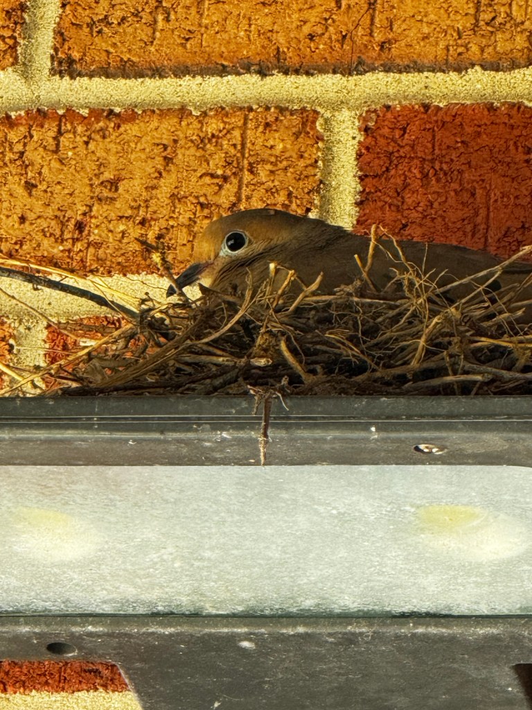this mourning dove has nested above the light on the loading dock at the university